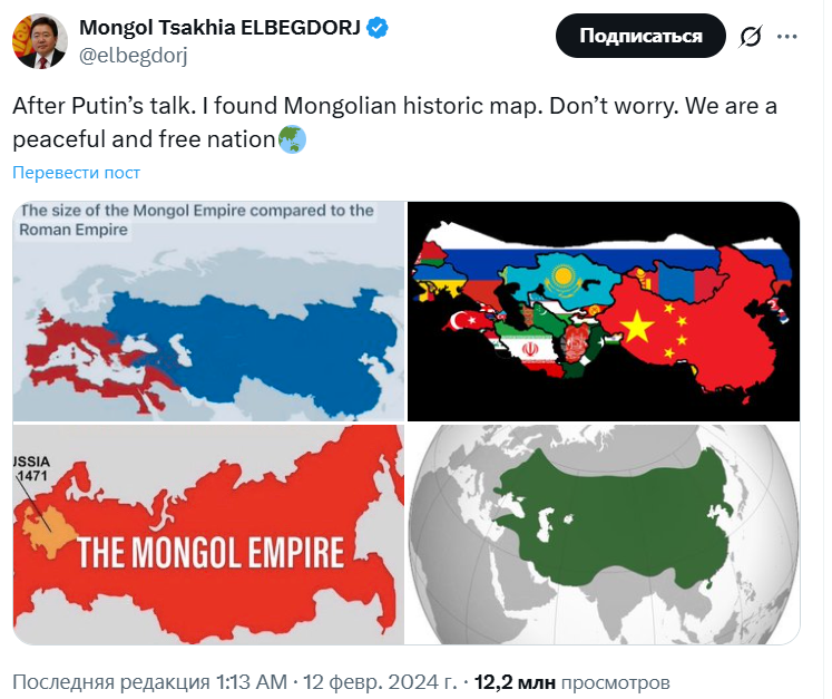 После интервью Путина Такеру Карлсону с историческими претензиями на территорию Украины Элбэгдорж написал в твиттере: «Нашел историческую карту Монголии. Не волнуйтесь, мы мирная и свободная страна».