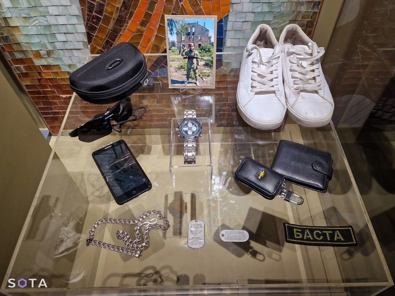 Впрочем, пояснительная надпись убивает наповал: «Когда украинская армия поняла, что населенный пункт Попасная (Луганская Народная Республика) им не достанется, то приняла решение полностью разрушить город. Вооруженные силы Украины обстрелами превратили Попасную в город-призрак. Всю инфраструктуру, все коммуникации боевики сравняли с землей. Были разрушены многоэтажные дома, магазины, школы, детские сады и православный храм. Среди немногого что уцелело в городе, была фреска святых апостолов Петра и Павла». Таким образом, несчастную Попасную, которую российская армия штурмовала два с лишним месяца, нещадно утюжа авиацией и артиллерией, оказывается, разрушили сами украинцы, вероятно, из свойственной им врожденной вредности и русофобии. Рядом с названными «фресками» мозаиками — среди прочих личных вещей — белые тапочки погибшего бойца с позывным «Баста».