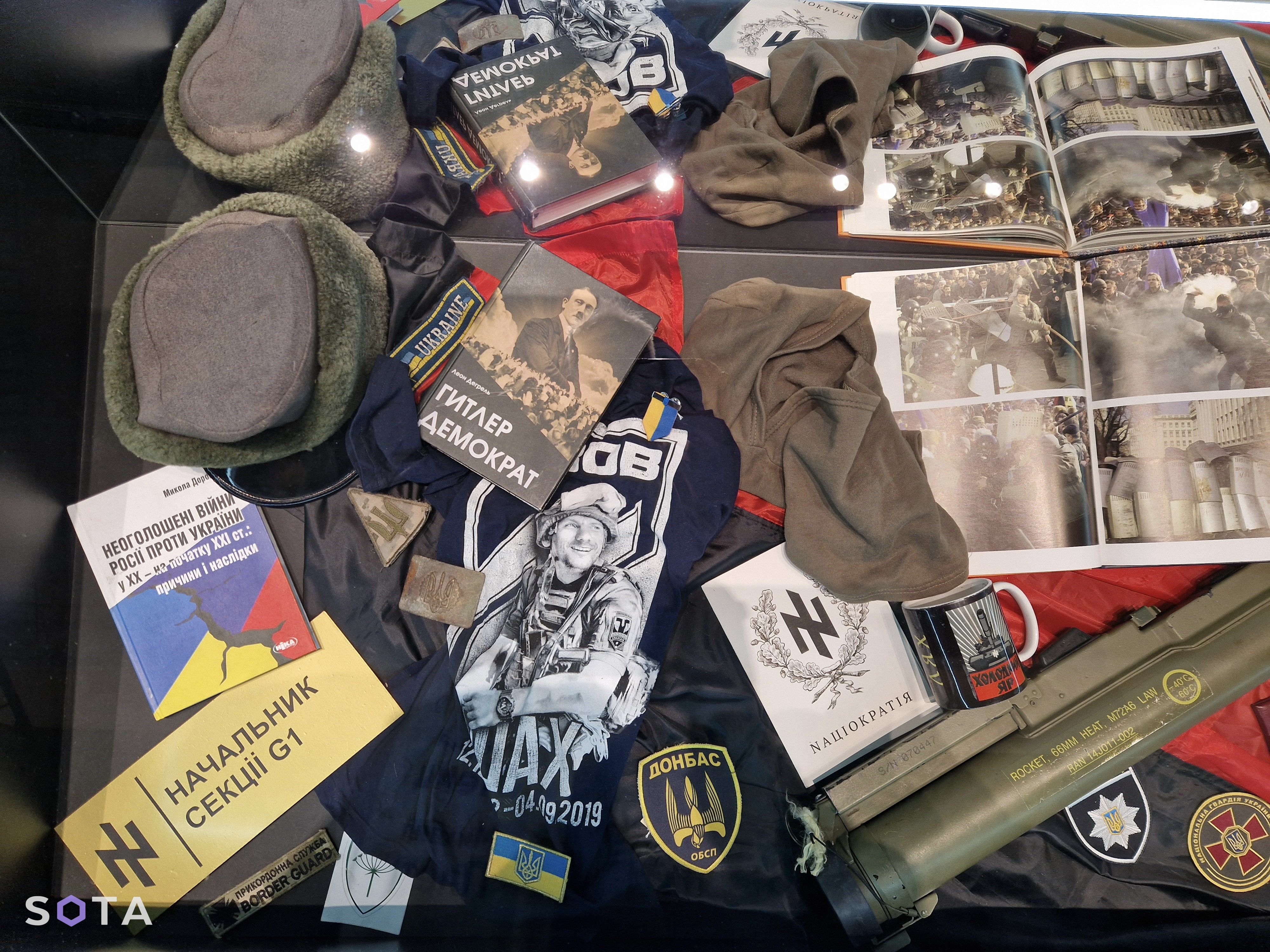 Украинская же часть экспозиции оформлена уже совсем в стиле Arte povera — направления в современном искусстве, известного своими инсталляциями из мусора. На полу под стеклянной витриной расположились кучей сваленные: мёрч с эмблемами «Азова», шевроны, какие-то камуфляжные тряпки, бытовые респираторы, пустые патронные ленты и отстрелянные трубы от РПГ, украинские книжки про Майдан и всяких бандер с шукевичами. Среди книжек выделяется изданная, по-видимому, в России «Демократ Гитлер» Леона Дегреля — командира 28-й добровольческой дивизии СС «Валлония», лидера бельгийских рексистов, приключенца и авантюриста, послужившего прообразом журналиста Тинтина из комиксов Эрже. Кстати, книги Дегреля регулярно продаются в книжной «Листве» русского патриота Саввы Федосеева.