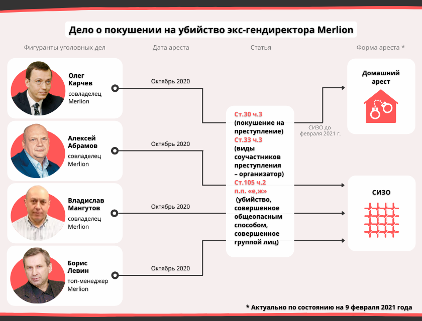 Главное следственное управление СК России прекратило уголовное дело в отношении совладельцев Merlion Алексея Абрамова, Олега Карчева, Владислава Мангутова, а также в отношении Бориса Левина в связи с отсутствием события инкриминируемых им преступлений, т.е. по реабилитирующим их основаниям. Об этом 21 февраля 2022 года изданию TAdviser сообщил представитель их защиты.