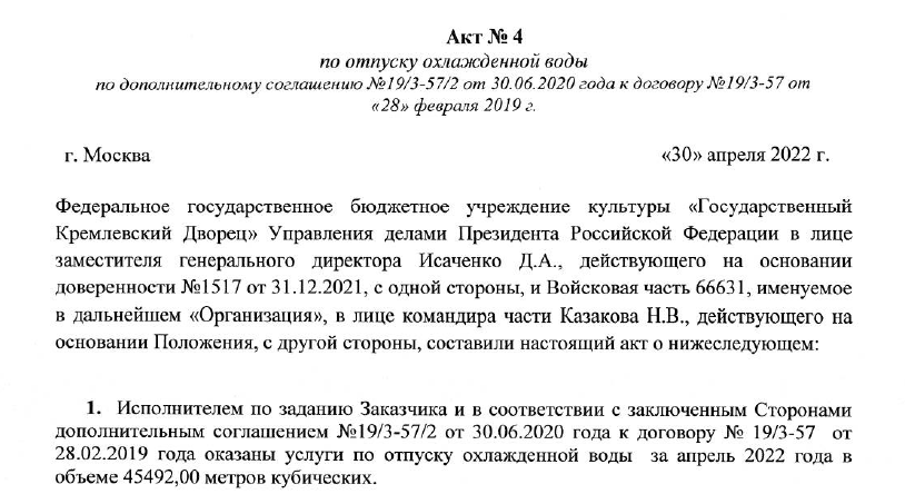 Спрашивается – при чем тут холодильники в Кремле? Кремль ни при чем, а вот Дворец… Дворец поставляет холод все той же бывшей войсковой части 66631. По состоянию на 2022 год объем поставок холодной воды составил 45,5 миллионов литров. В месяц. Это не менее 550 миллионов литров в год, что ощутимо больше закупок Администрации президента для Кремля в том же периоде.