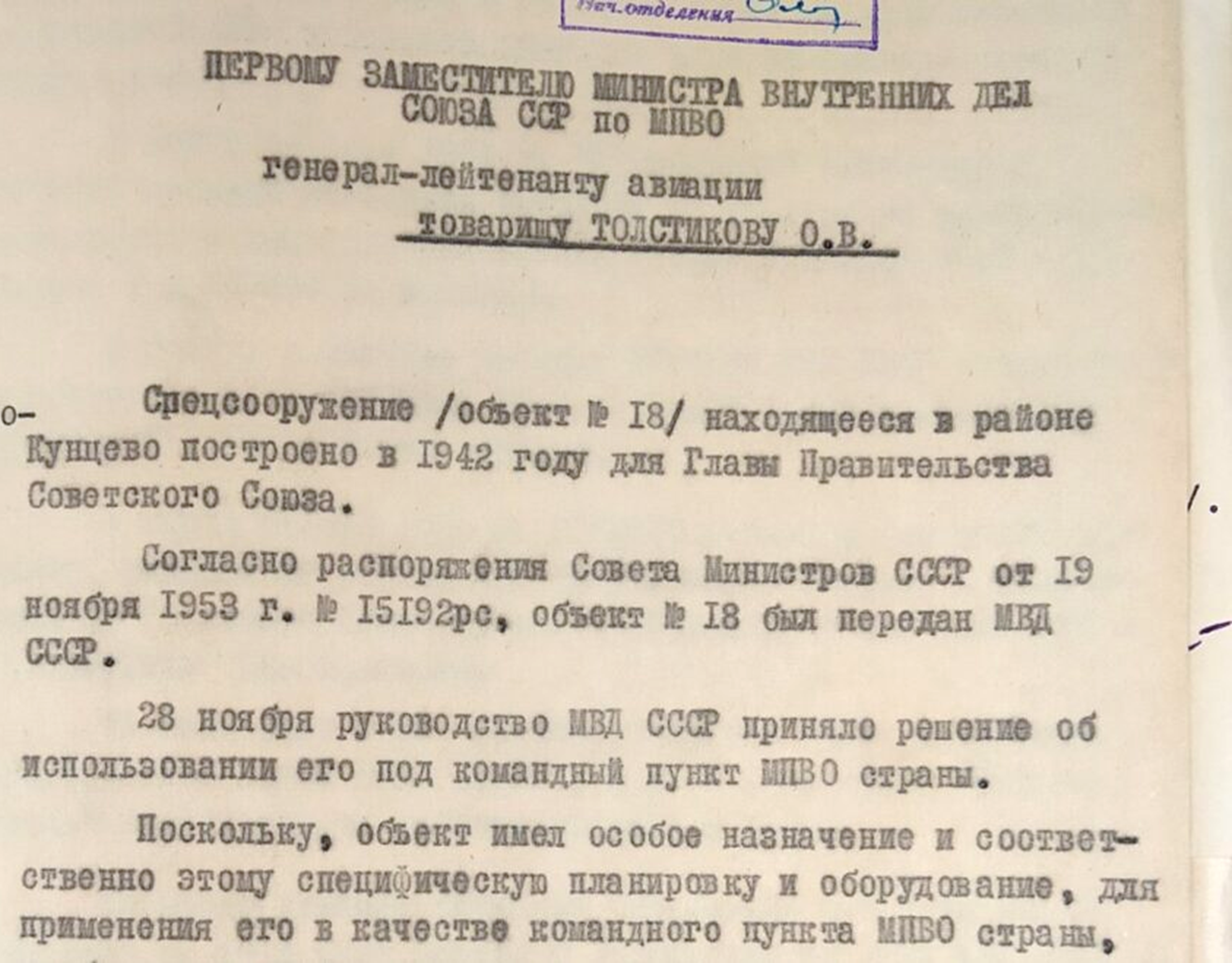Решение о строительстве подземного бункера при ближней даче Сталина было принято в мае 1941 года, незадолго до нападения Германии на СССР, в числе шести убежищ для высших должностных лиц. Будущий «секретный бункер» получил обозначение «Объект №18»