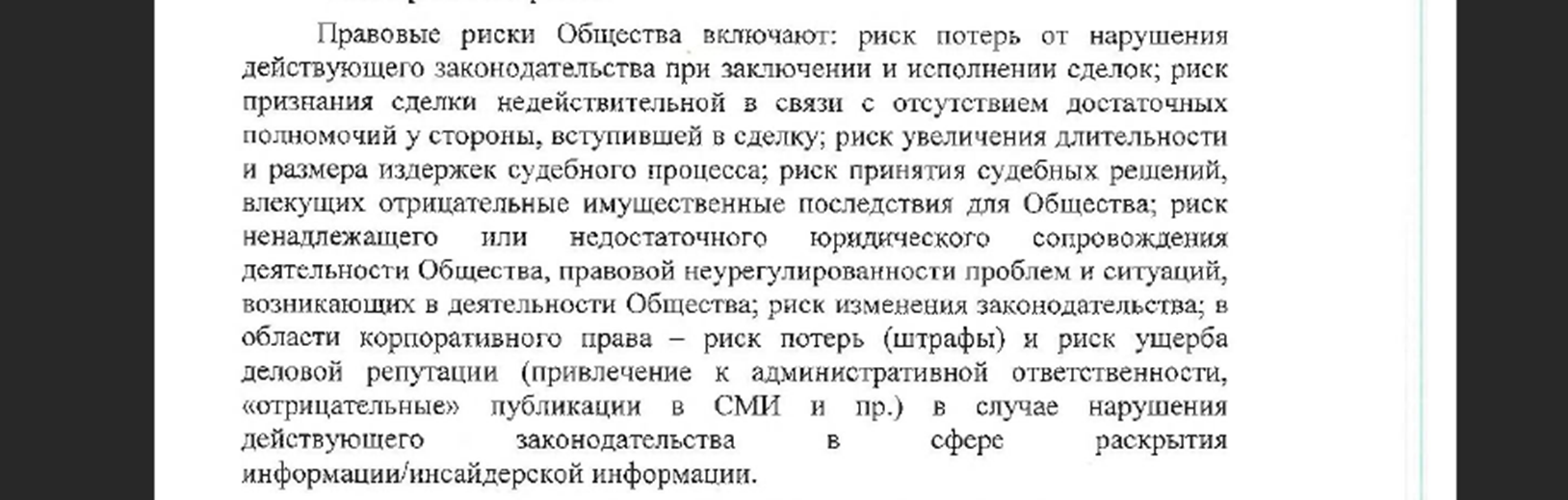 Полностью оказались скрыты правовые риски, и не зря – ведь в них прописаны и готовность нарушать закон, и возможность ничтожных сделок и риск негатива в СМИ. Вот: