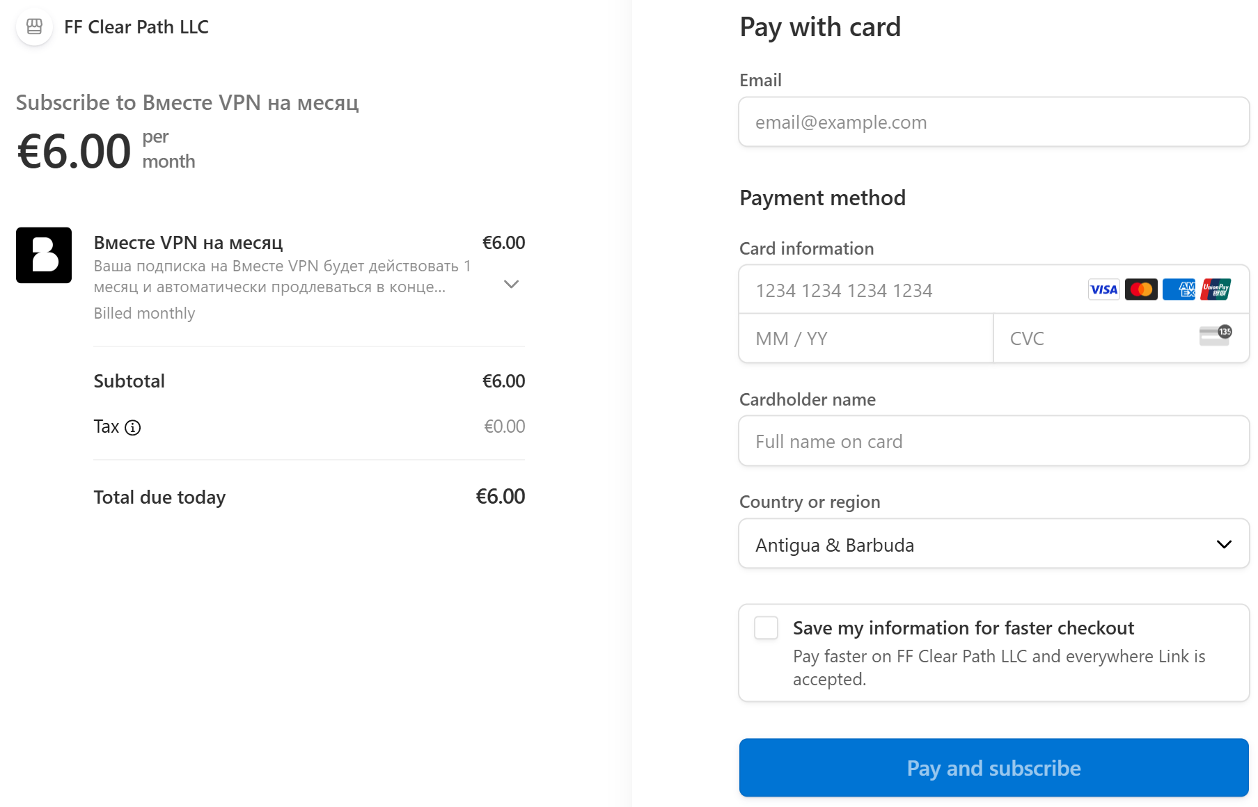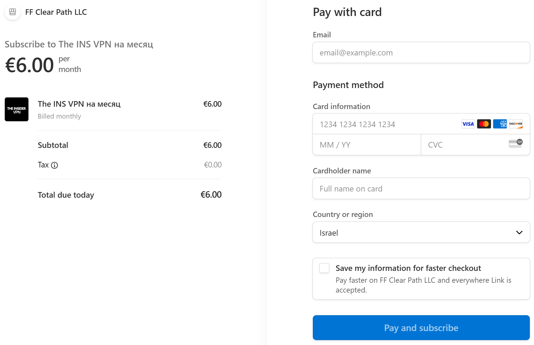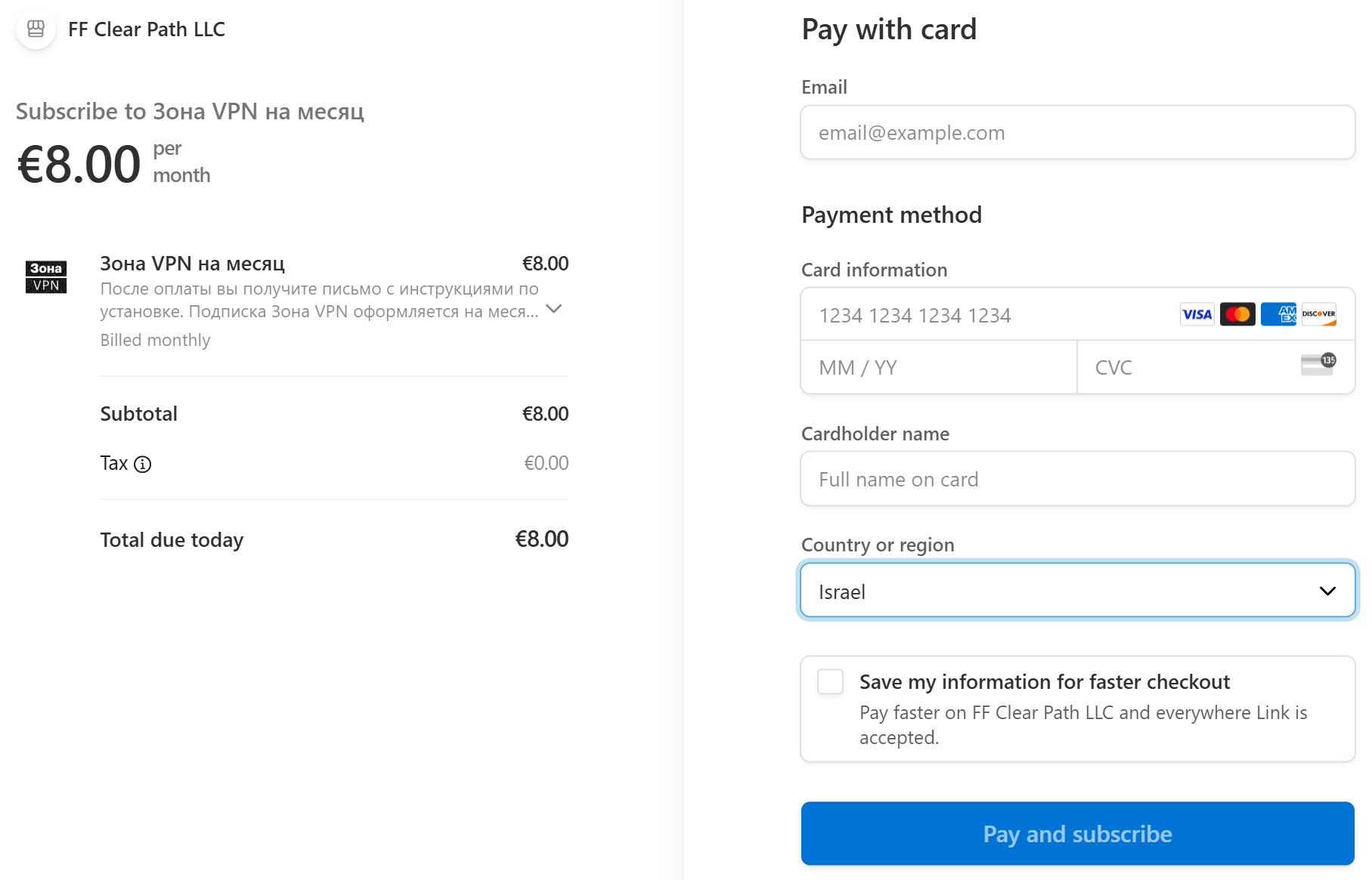 Самая очевидная связь возникает там, где «партнеры» предлагают покупать «свои» VPN не только за звезды телеграма (опция для российских карт), но и за валюту. В этом случае платежи уходят в Stripe получателю FF Clear Path LLC.