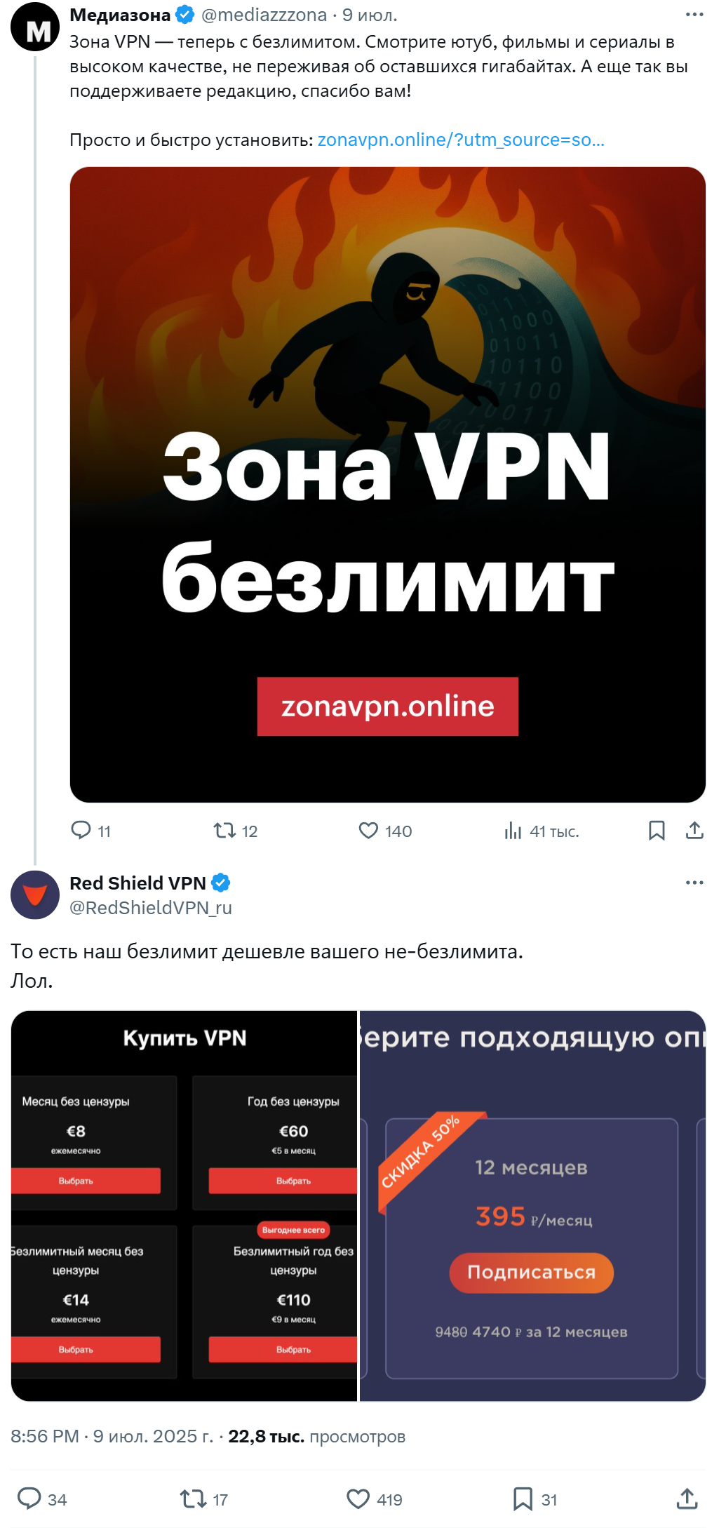 Однако уже в июне 2025 года тот же канал «Генератора» в качестве примера «альтернативных сервисов, которые раздают стабильный и бесплатный VPN, тянущий YouTube» приводил якобы не связанный с собой проект VPNovaya и активно рекомендовал его.
