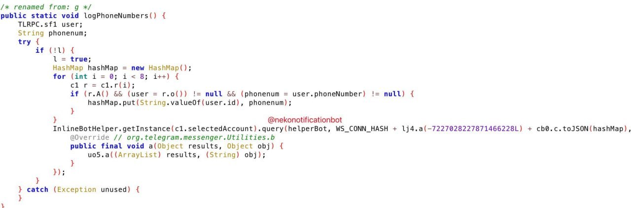 «Бэкдор скрыт в файле Extra. java, который отличается от залитого в репозиторий шаблона. Обфусцированный код посылает данные как inline-запрос боту @nekonotificationbot, от чего не остается следа. В том же файле реализован пробив аккаунтов через ряд ботов: возможно, слитые данные используются для пополнения их баз».