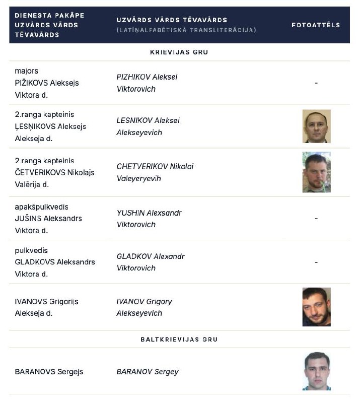 Среди них указаны майор Алексей Пыжиков, капитаны 2-го ранга Алексей Лесников и Николай Четвериков, подполковник Александр Юшин, полковник Александр Гладков, а также офицер ГРУ Григорий Иванов. Со стороны Беларуси упомянут Сергей Баранов. По данным службы, Иванов с 2017 года занимался сбором информации «о настроениях в латвийском обществе, объектах критической инфраструктуры и присутствии сил союзников НАТО».