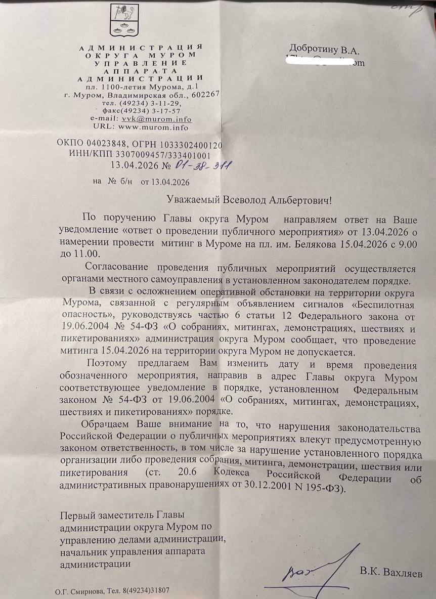 В письме за подписью первого заместителя главы администрации округа говорится, что митинг «на территории Мурома не допускается» из-за «осложнения оперативной обстановки», связанного с регулярным объявлением сигнала «Беспилотная опасность».